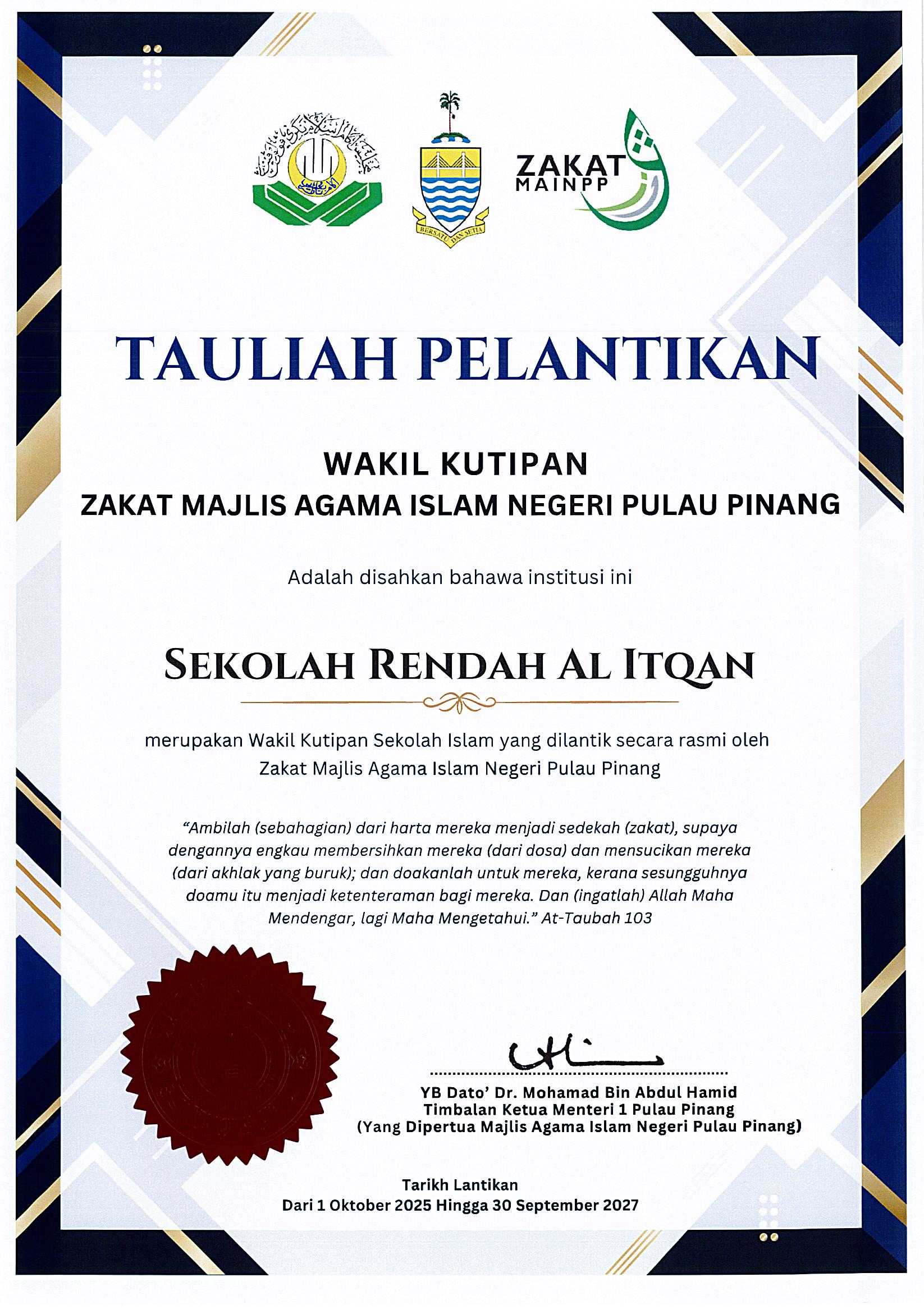 ✅ Sekolah Rendah Al-Itqan merupakan Wakil Kutipan Zakat (Sekolah Islam) yang dilantik secara rasmi oleh Zakat Majlis Agama Islam Pulau Pinang (MAINPP).