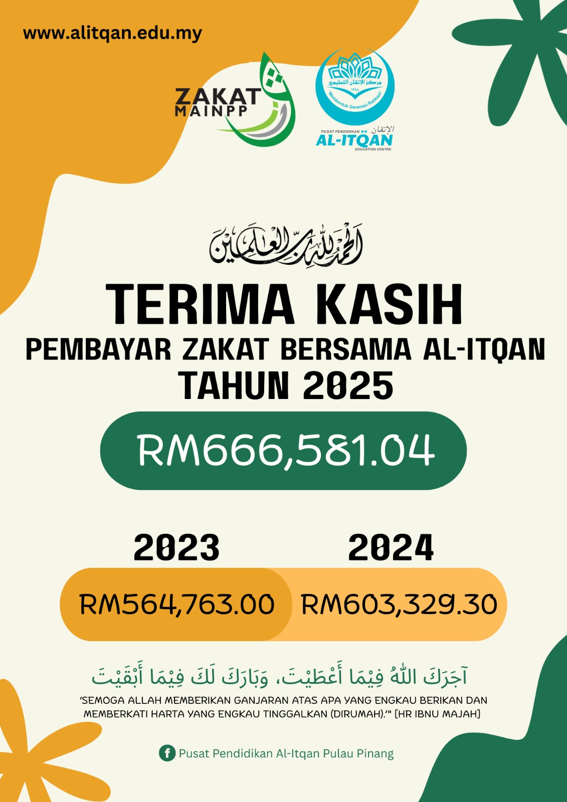 🌸Setulus penghargaan diucapkan kepada para pembayar zakat tahun 2025 yang telah menunaikan amanah melalui Pusat Pendidikan Al-Itqan. 🌸Setiap titipan zakat yang disampaikan bukan sekadar memenuhi tuntutan kewajipan, bahkan mengalir sebagai rahmat, menyemai harapan dan...